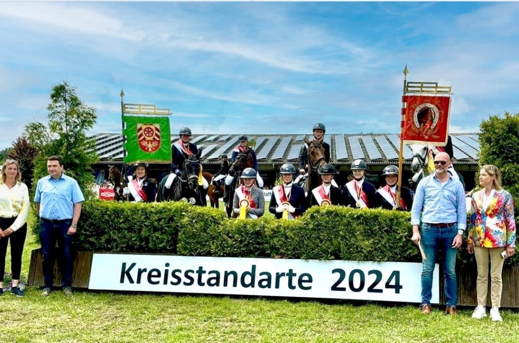 Eine Gruppe von Reitern hinter einem Naturhindernis bei der Platzierung zur Kreisstandarte 2024